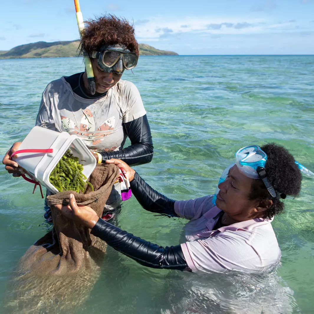 Kvinnliga skördare spenderar upp till åtta timmar i vattnet, tre dagar i veckan, med att handplocka vild Nama, även kallad "havsdruvor." Nama återhämtar sig snabbt (inom 3–4 veckor), och skörden påverkar inte ekosystemet negativt. Skördeprogrammet för Nama gör det möjligt för fijianska kvinnor att få en inkomst och utbilda sig mer. Läs mer här